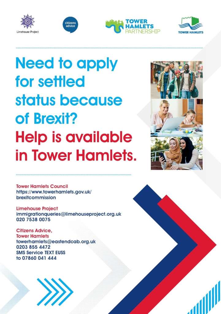 Tower Hamlets: The EU Settlement Scheme Share this: Click to share on X (Opens in new window) X Click to share on Facebook (Opens in new window) Facebook Click to print (Opens in new window) Print More Click to share on WhatsApp (Opens in new window) WhatsApp Like Loading... Related