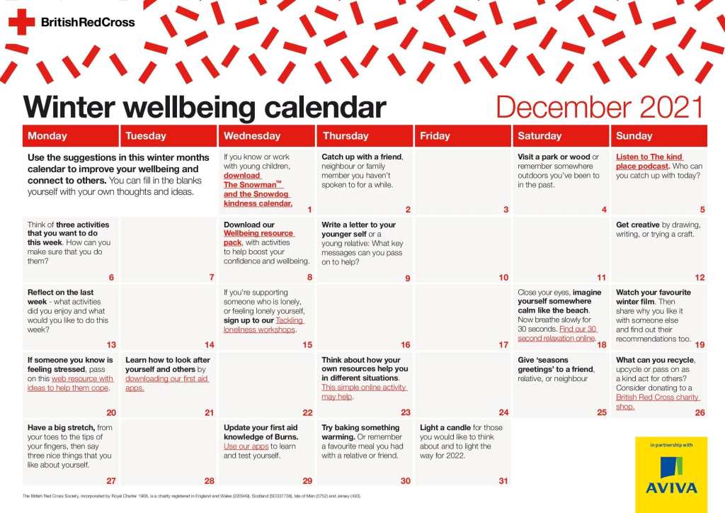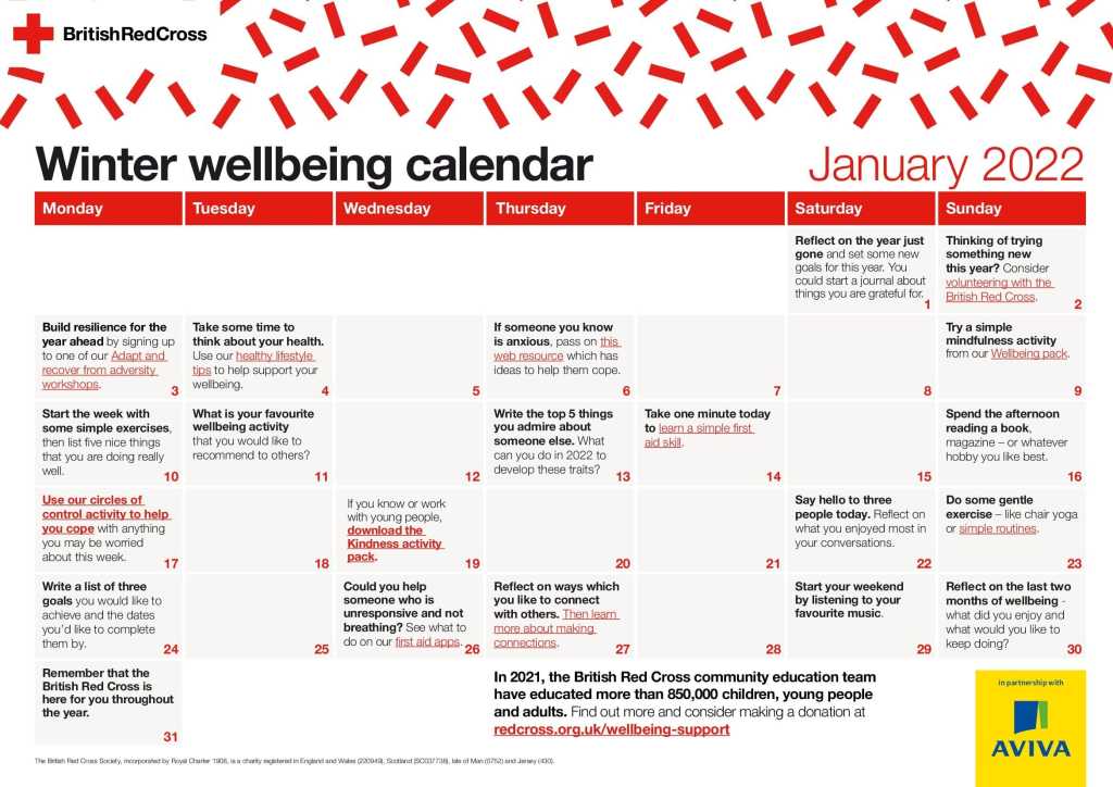 British Red Cross Wellbeing Calendar Share this: Click to share on X (Opens in new window) X Click to share on Facebook (Opens in new window) Facebook Click to print (Opens in new window) Print More Click to share on WhatsApp (Opens in new window) WhatsApp Like Loading... Related