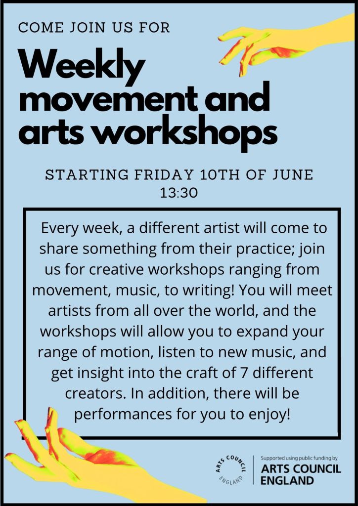 Weekly Movement & Arts Workshops Share this: Click to share on X (Opens in new window) X Click to share on Facebook (Opens in new window) Facebook Click to print (Opens in new window) Print More Click to share on WhatsApp (Opens in new window) WhatsApp Like Loading... Related